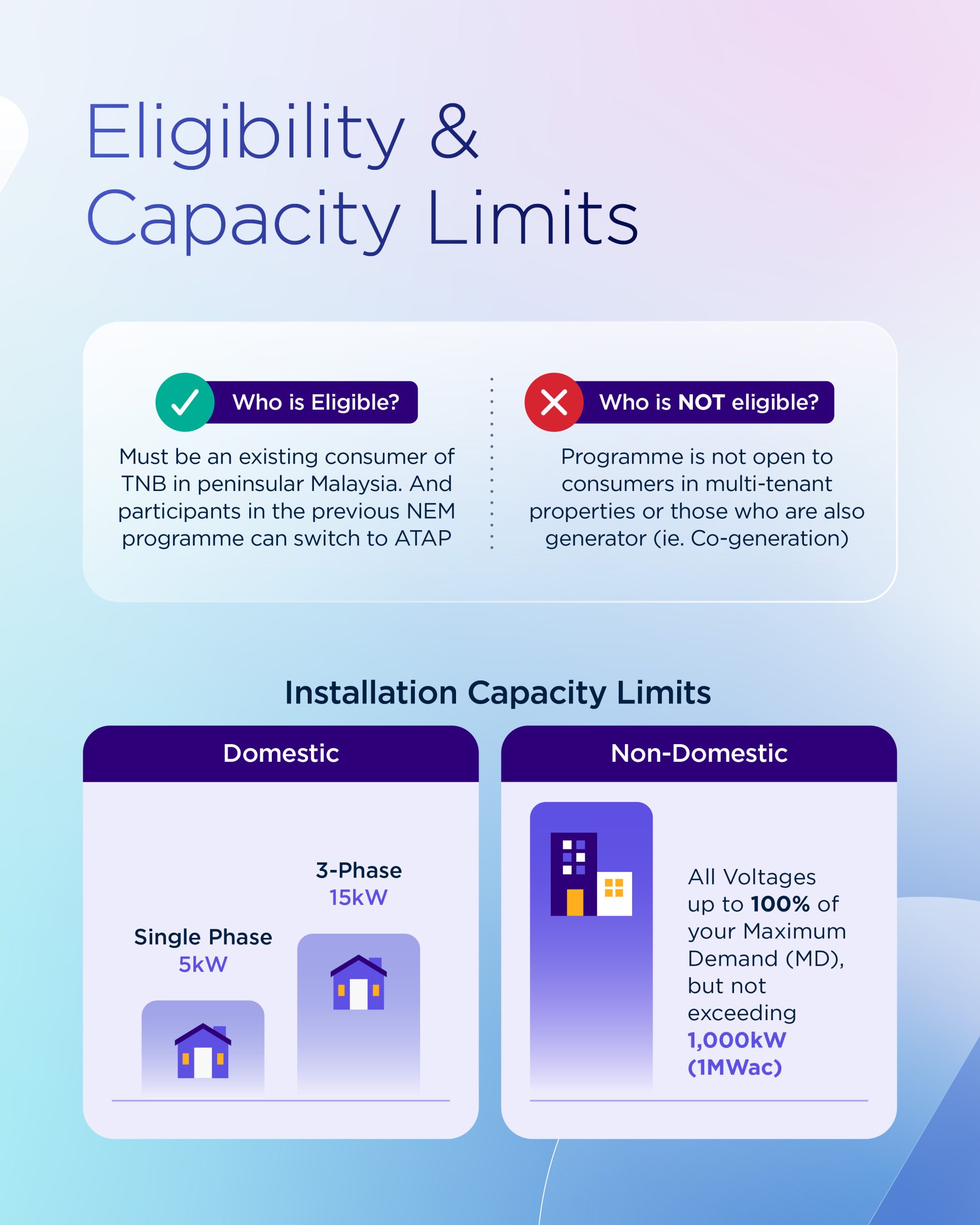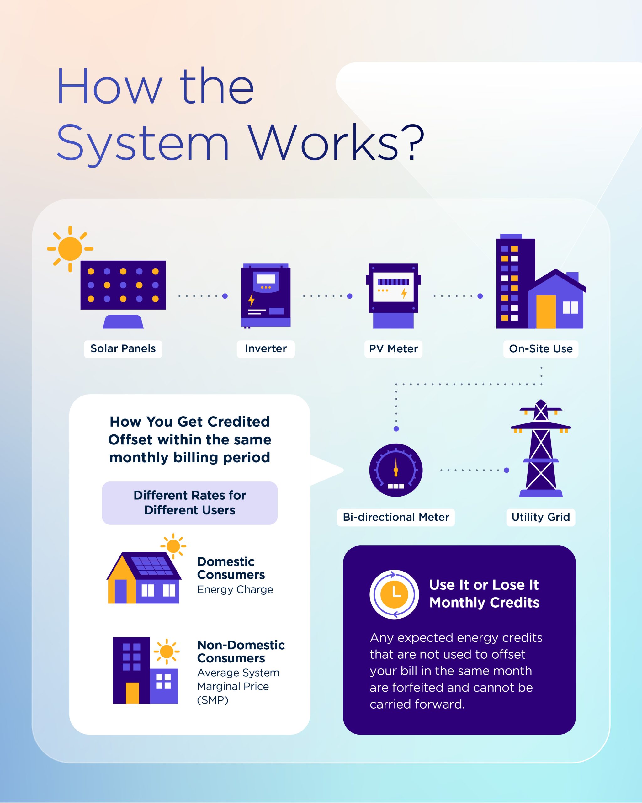 Solar PV systems generate the most power during the day. If you use more energy at night, you can either earn credits by exporting extra daytime solar to the grid (ATAP only), or consider a battery system (BESS) to store excess energy for night use — especially if you're under SELCO, where export is not allowed.