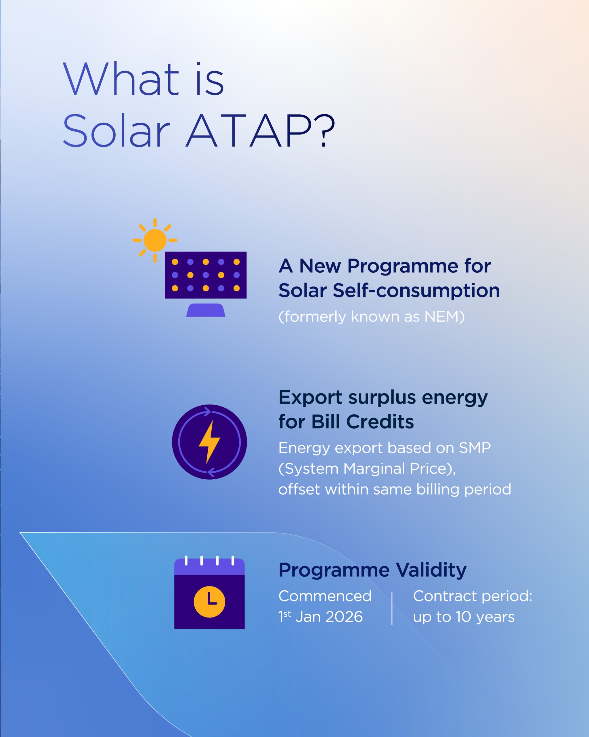 With Solar ATAP, you use your own solar power first — reducing your electricity bill right away. Any extra energy your system produces is sent to the grid, and the government gives you credits based on current energy market rates. These credits help cover what you still need from the grid.